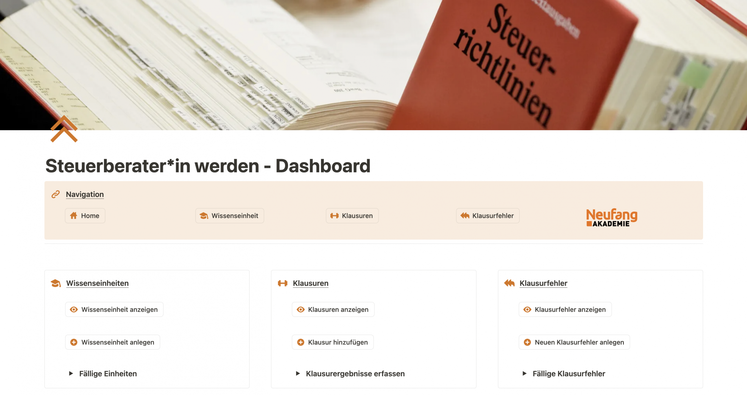 Der Weg zur erfolgreichen Steuerberater-Prüfung ist lange. Ein riesiger Berg an Lernmaterial, Klausuren und das Gefühl, den Überblick zu verlieren? Das muss nicht sein. Das "Steuerberater*in werden - Dashboard" wurde entwickelt, um genau hier zu helfen. Mit dem Steuerberater*in werden Dashboard bieten wir Ihnen die Möglichkeit, Ihre Unterlagen auf dem Weg zur Steuerberaterprüfung besser zu organisieren und sich so effizienter auf Ihre Prüfung vorzubereiten.